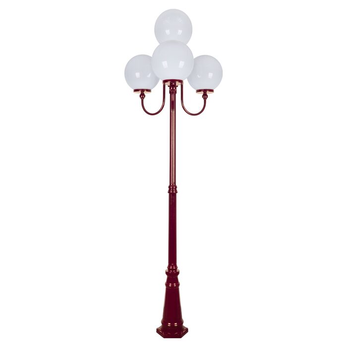 Lisbon 4 light 2.54m quadruple head post light, die-cast aluminium body complete with 300mm opal acrylic sphere (3 x curved arm and 1 x light on top of post). Made in Italy, assembled and powder coated in Australia.