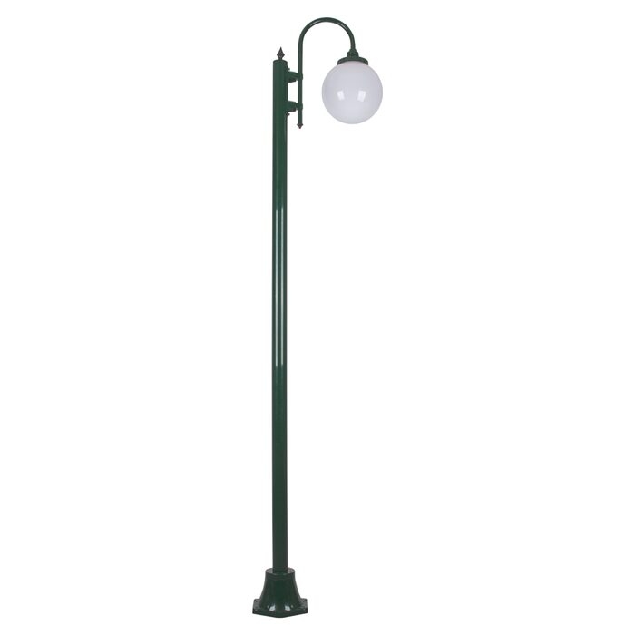 Lisbon 1 light curved arm 2.4m single head down facing post light, die-cast aluminium body complete with 250mm opal acrylic sphere. Made in Italy, assembled and powder coated in Australia.