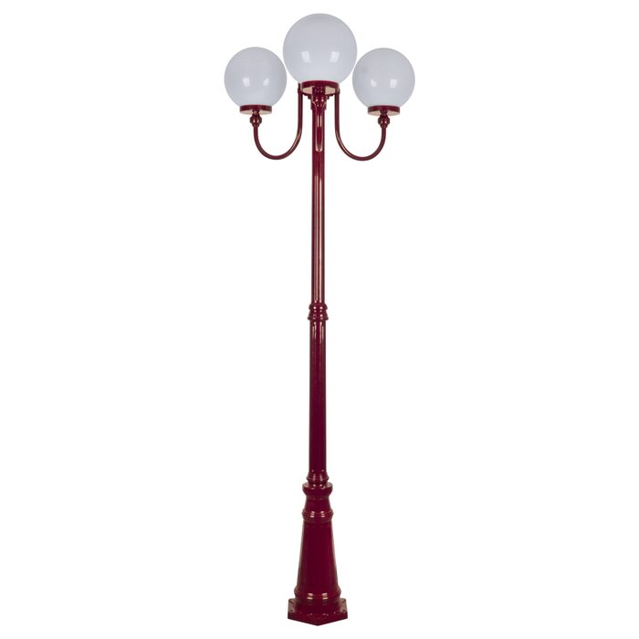 Lisbon 3 light curved arm 2.29m triple head post light, die-cast aluminium body complete with 250mm opal acrylic sphere. Made in Italy, assembled and powder coated in Australia.
