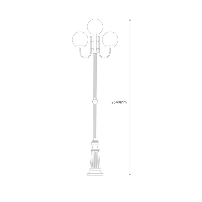 Lisbon 3 light 2.54m triple head post light, die-cast aluminium body complete with 250mm opal acrylic sphere (2 x curved arm and 1 x light on top of post). Made in Italy, assembled and powder coated in Australia.