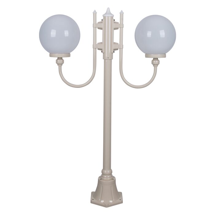 Lisbon 2 light curved arm 1.32m twin head post light, die-cast aluminium body complete with 250mm opal acrylic sphere. Made in Italy, assembled and powder coated in Australia.
