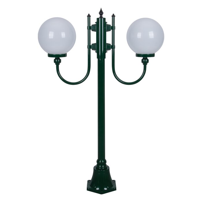 Lisbon 2 light curved arm 1.32m twin head post light, die-cast aluminium body complete with 250mm opal acrylic sphere. Made in Italy, assembled and powder coated in Australia.