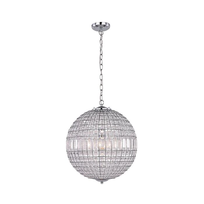 The suspended glass drops and panels encompass the central globe, scattering crystal white light through the many facets the globe design creates.