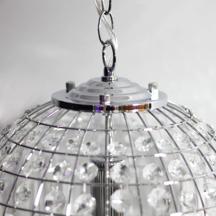 The suspended glass drops and panels encompass the central globe, scattering crystal white light through the many facets the globe design creates.