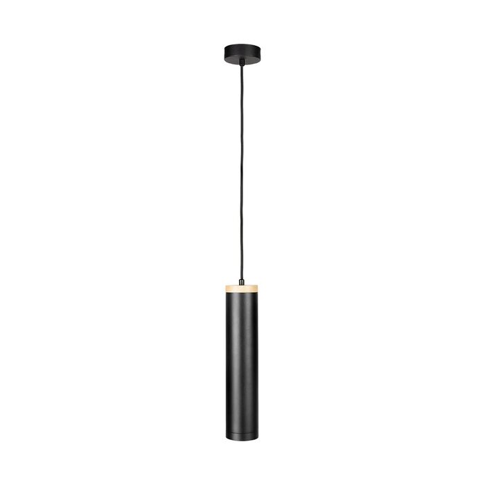 - Matt black with faux wood detail pendant light with fabric cord