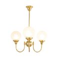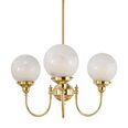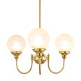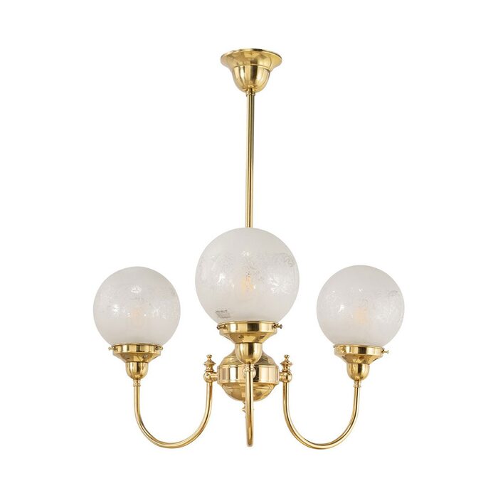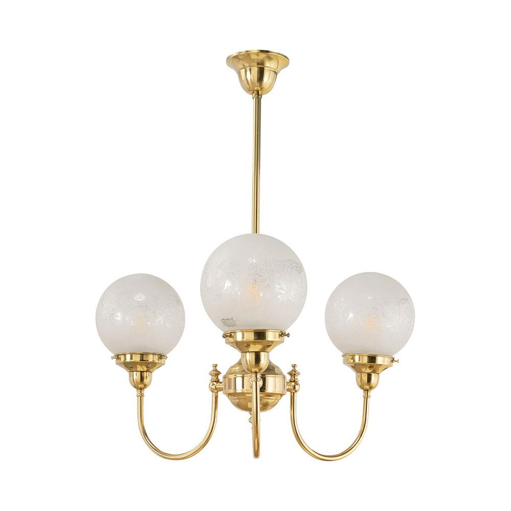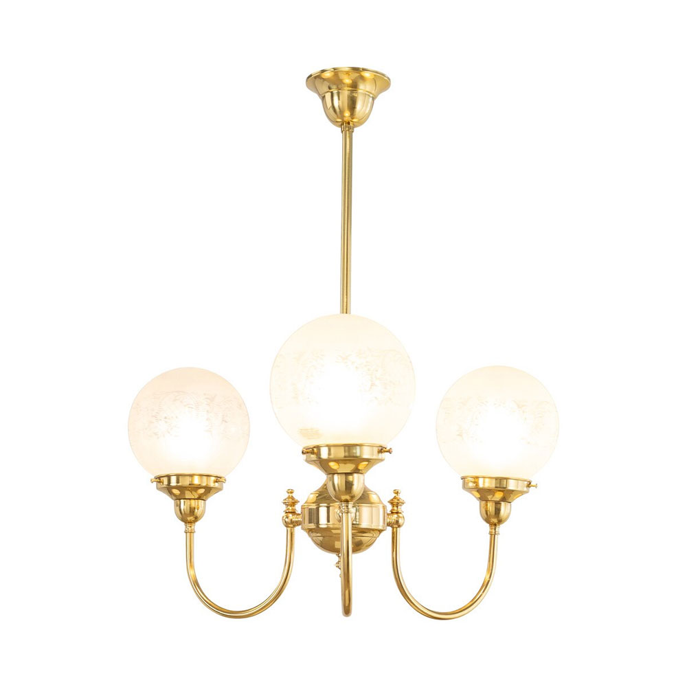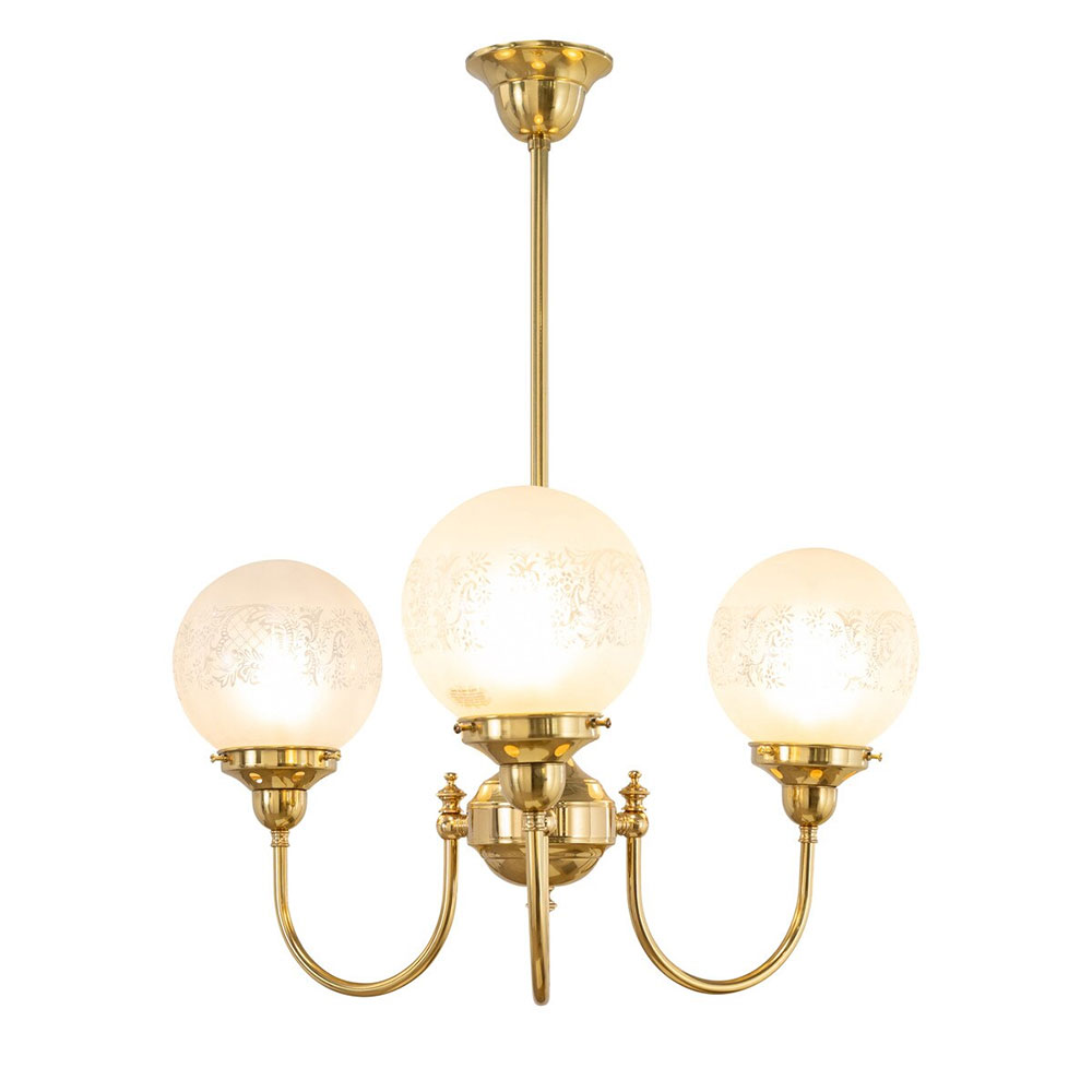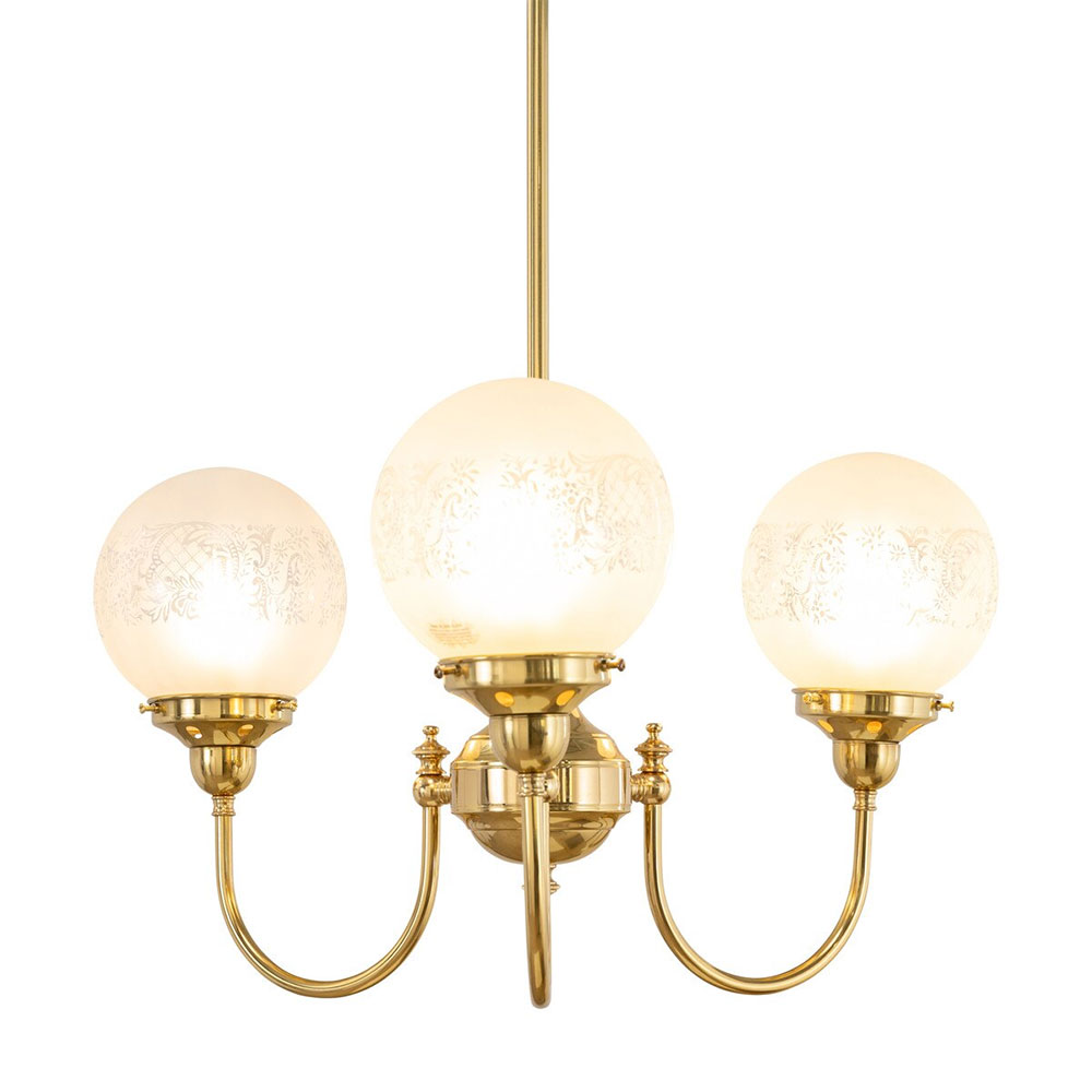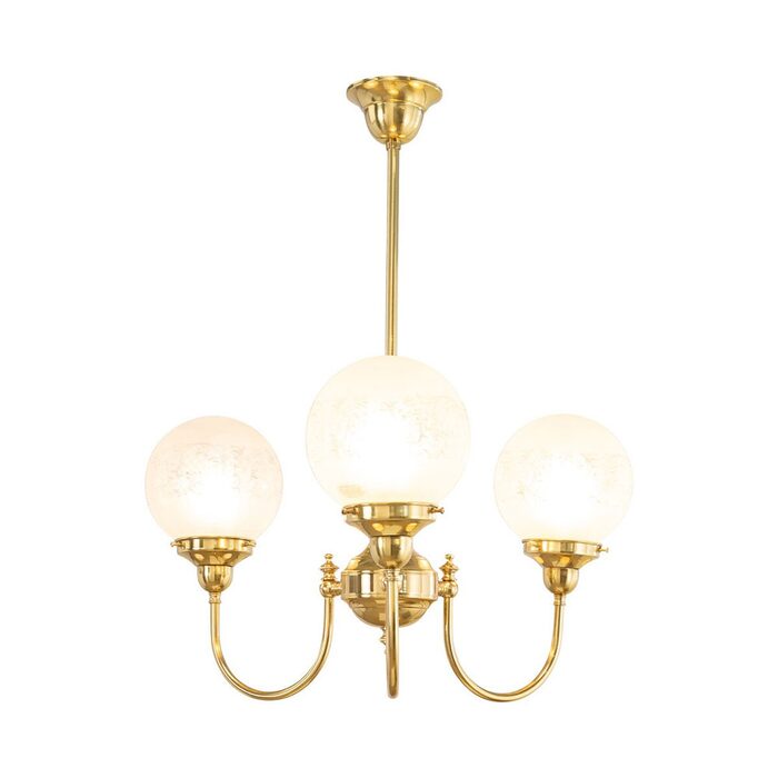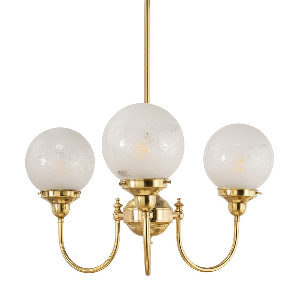 Each arm is adorned with a 6" Sheffield shade in hand-blown frost etched glass, diffusing light into a soft, ambient glow.