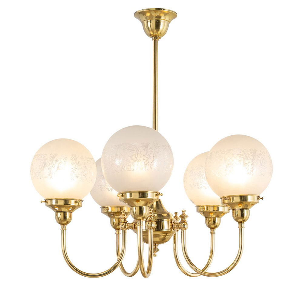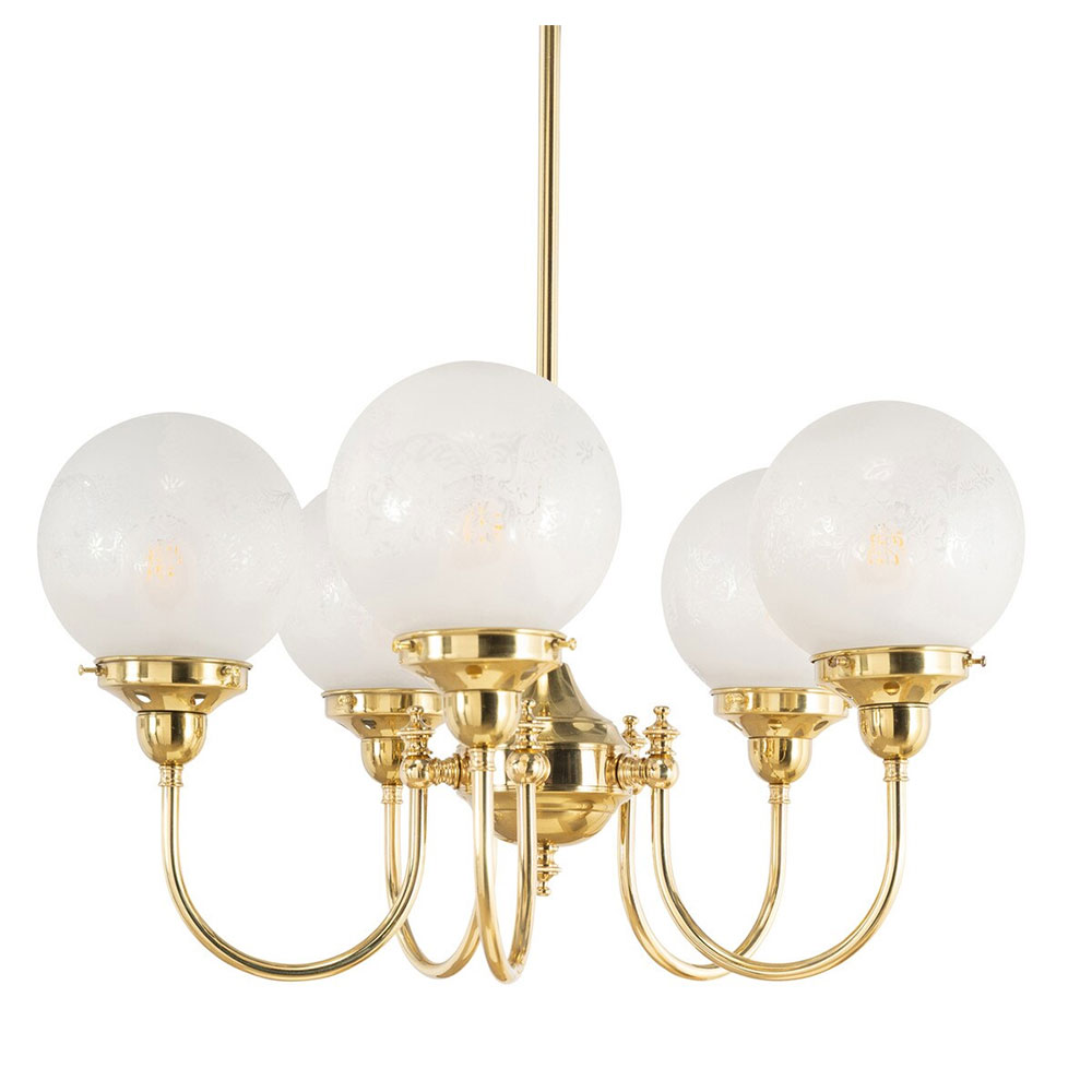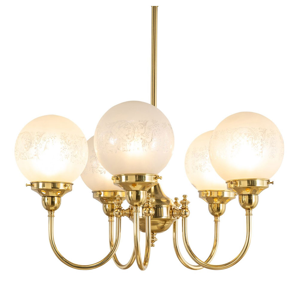Refined heritage style meets lasting quality in the Luke 5 Light Pendant in Polished Brass with 6" Sheffield Shades.