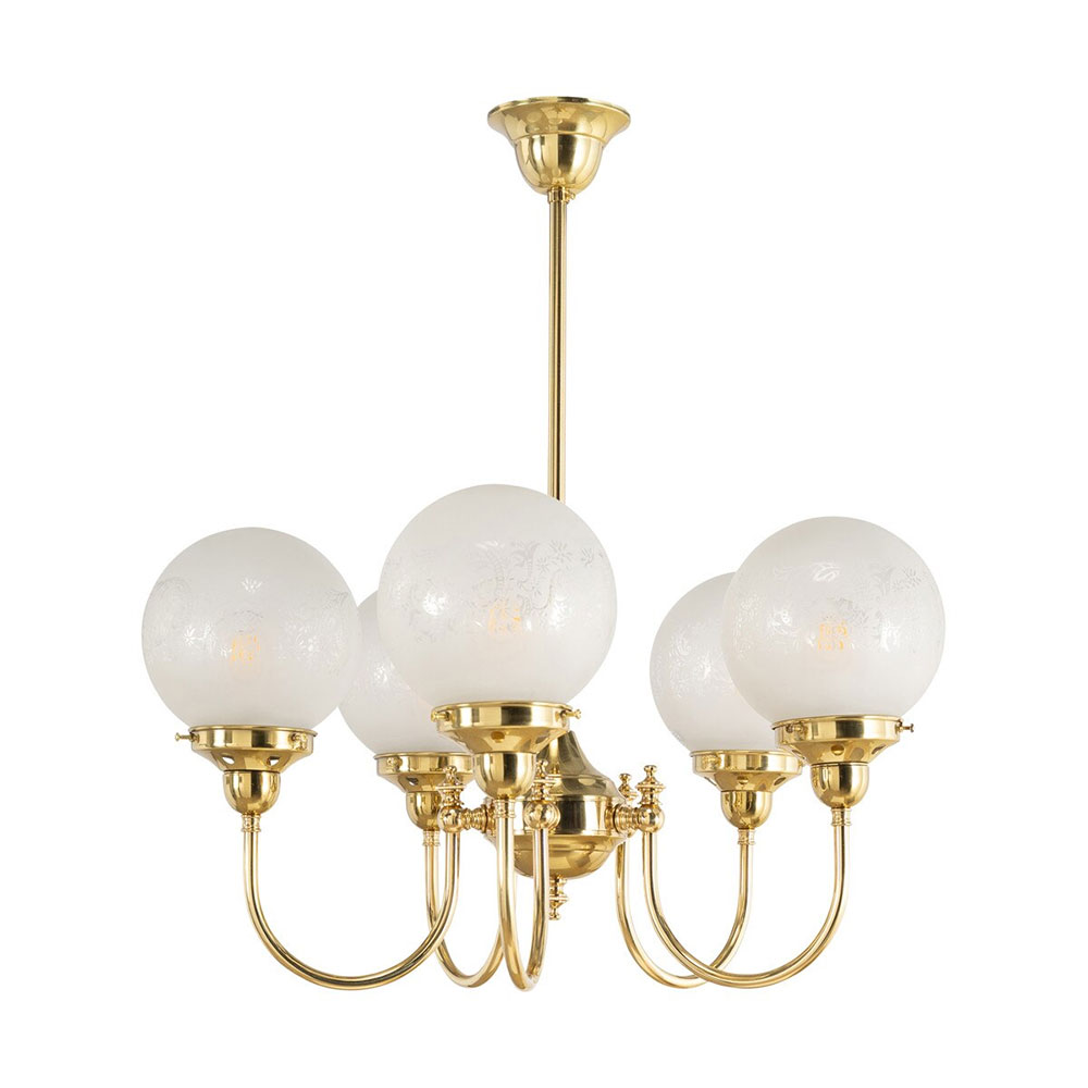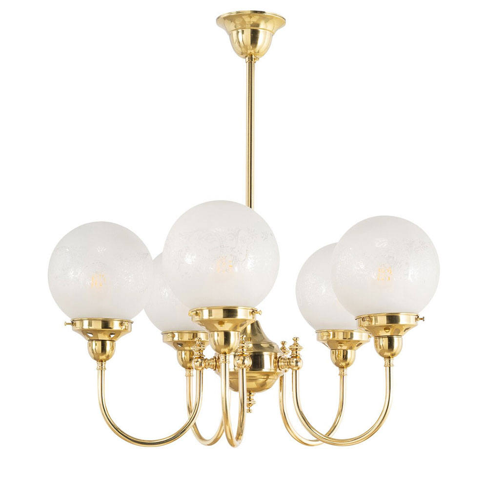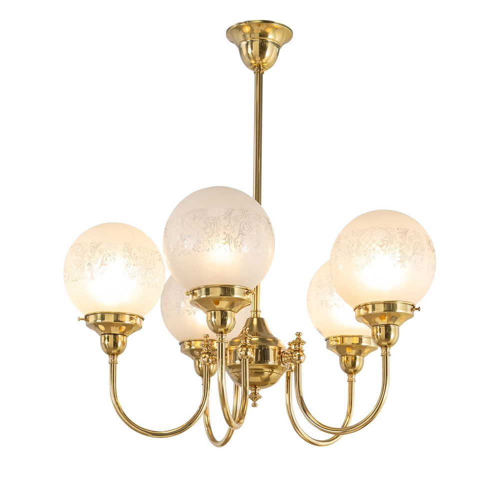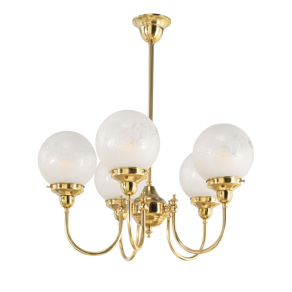 Refined heritage style meets lasting quality in the Luke 5 Light Pendant in Polished Brass with 6" Sheffield Shades.
