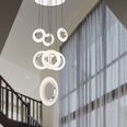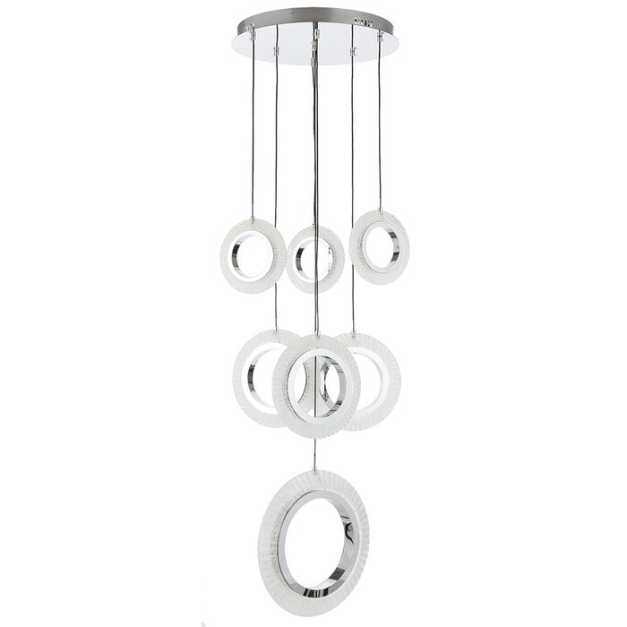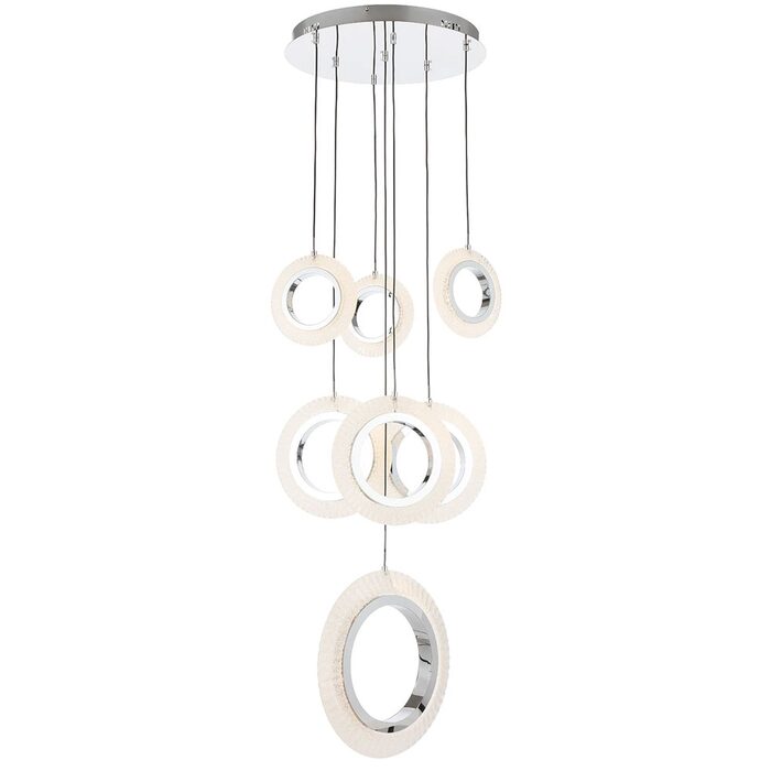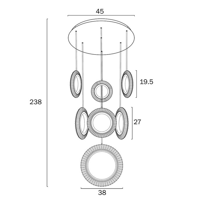 Hanging from the central ceiling canopy, unique facetted clear outer rings create an enchanting play of light, making it an ideal statement piece for various rooms.