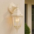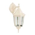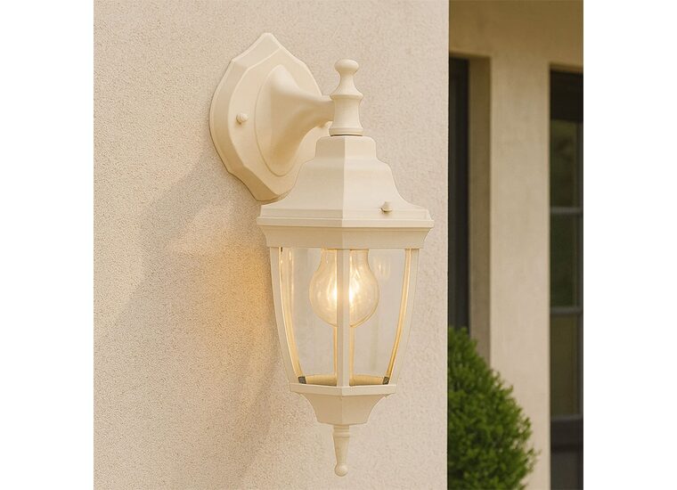 The Lunor Down Outdoor Wall Light combines timeless elegance with rugged functionality, featuring a classic downward-facing lantern design with rounded clear glass panes and an intricately detailed backplate that adds traditional charm to your home's exterior.