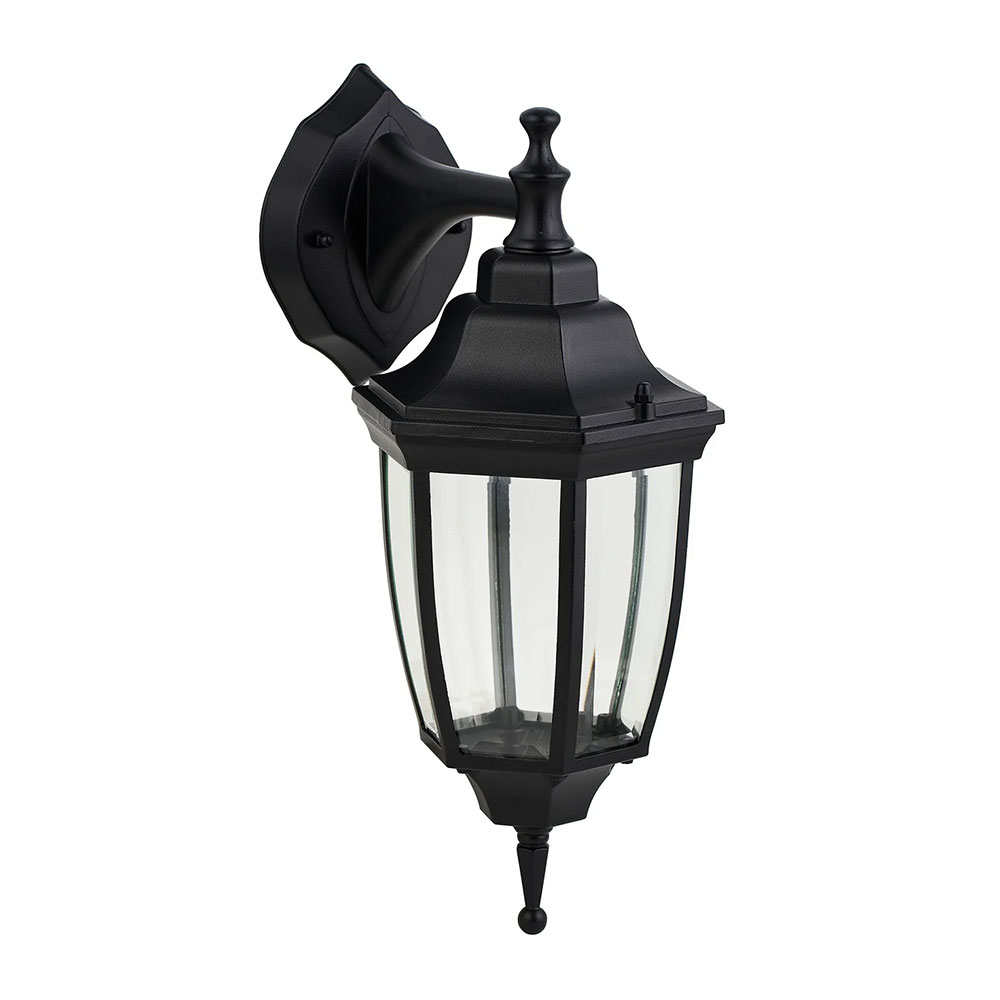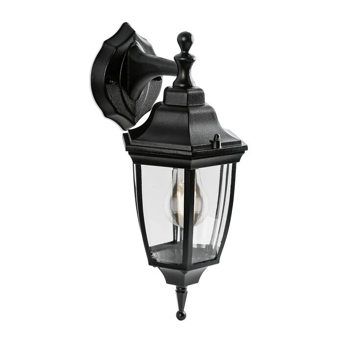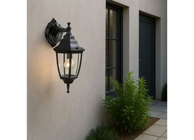 The Lunor Down Outdoor Wall Light combines timeless elegance with rugged functionality, featuring a classic downward-facing lantern design with rounded clear glass panes and an intricately detailed backplate that adds traditional charm to your home's exterior.