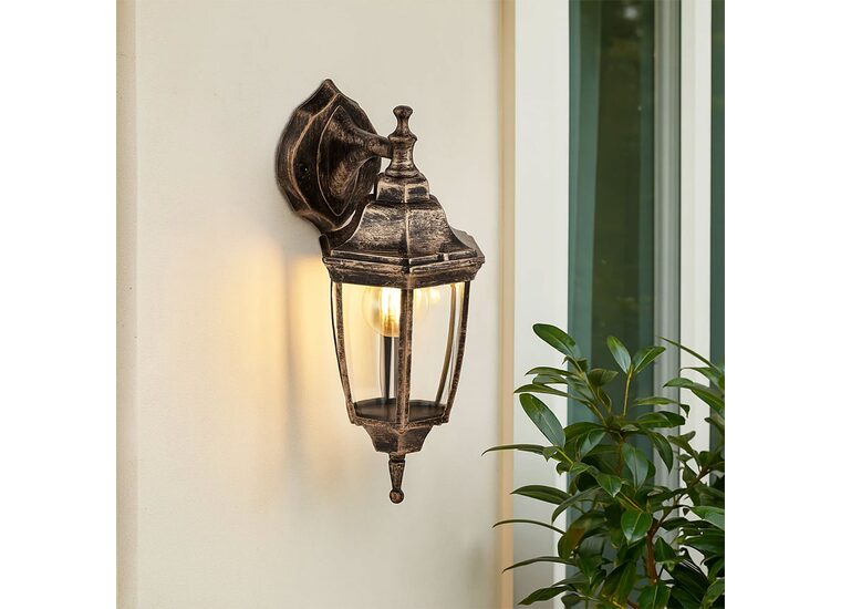 The Lunor Down Outdoor Wall Light combines timeless elegance with rugged functionality, featuring a classic downward-facing lantern design with rounded clear glass panes and an intricately detailed backplate that adds traditional charm to your home's exterior.