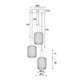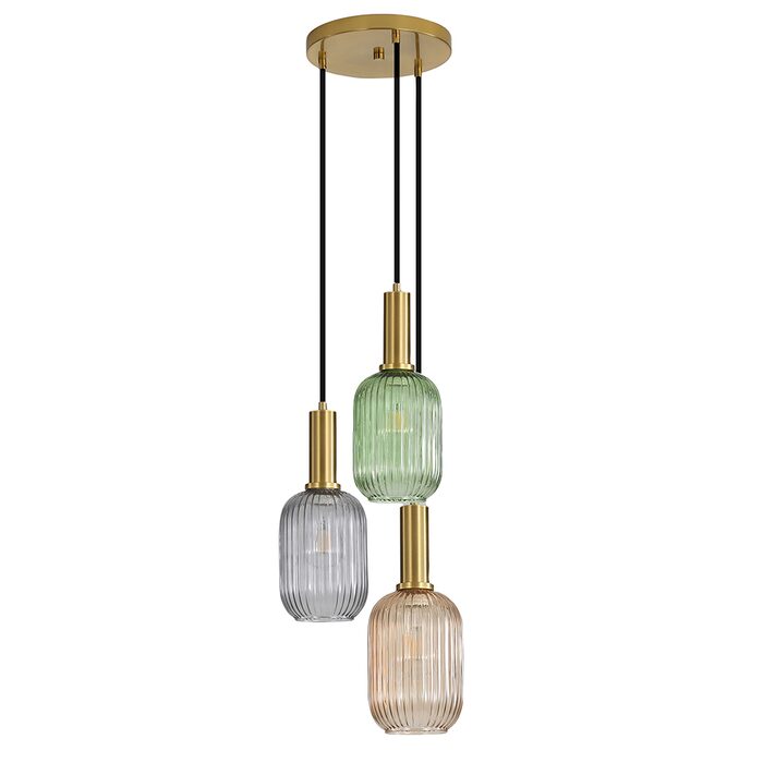 The LUXE TRILIGHT pendant features a mix of green, amber and smoke coloured reeded glass shades suspended on a black cloth covered cord with antique brass metalware.