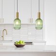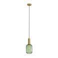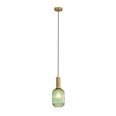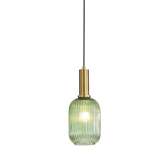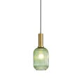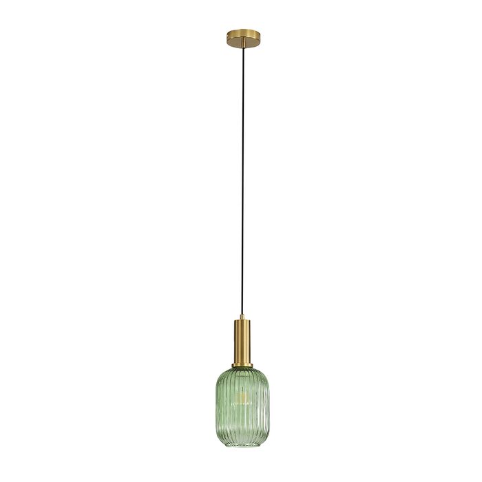 The LUXE series of pendants feature a colourful reeded glass shade with antique brass metalware suspended on a black cloth covered cord.