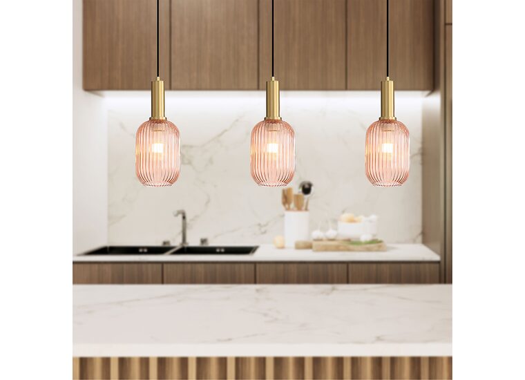 The LUXE series of pendants feature a colourful reeded glass shade with satin brass metalware suspended on a black cloth covered cord.