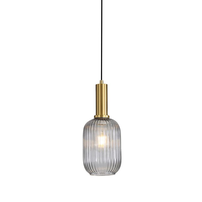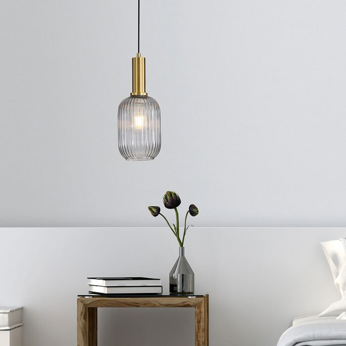 The LUXE series of pendants feature a colourful reeded glass shade with antique brass metalware suspended on a black cloth covered cord.