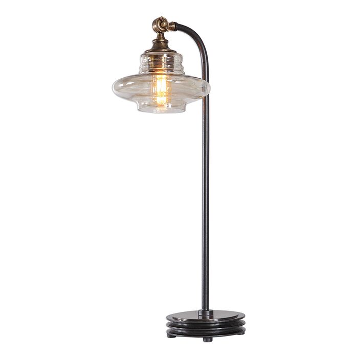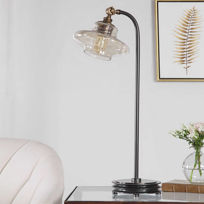 A shapely, amber colored glass globe is supported by a curved, black metal base, displayed on a unique cast iron foot with plated antique brass accents.