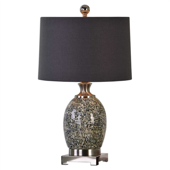 Heavily crackled taupe gray glass accented with plated brushed nickel metal details.