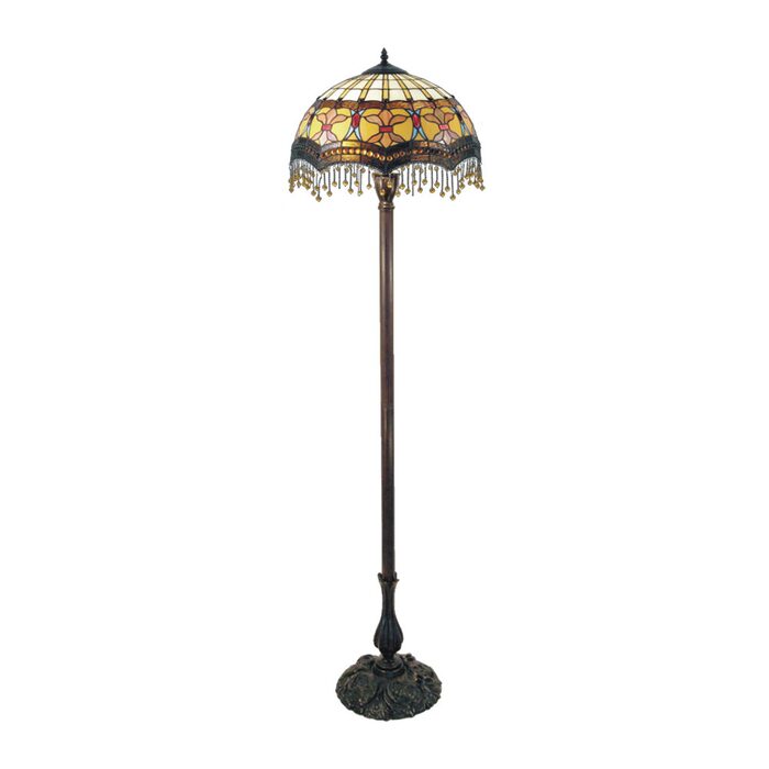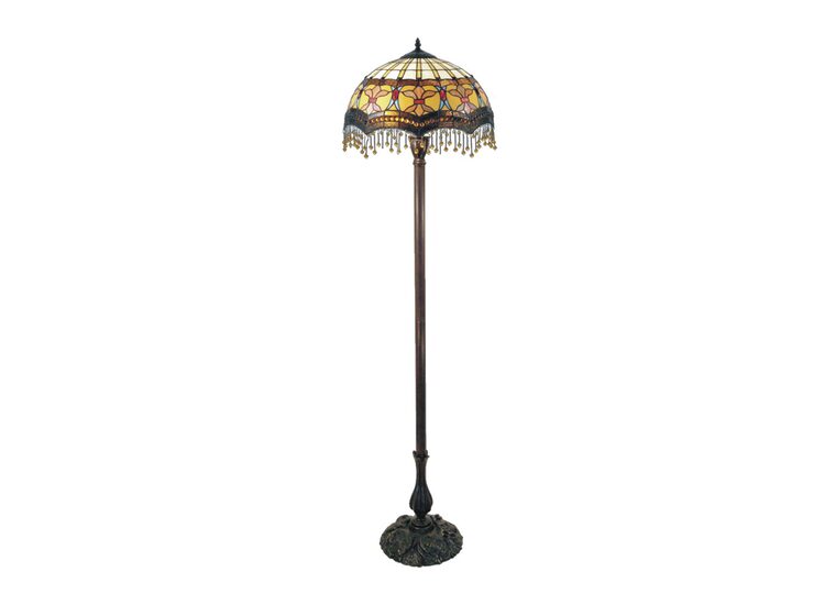 This beautiful Tiffany floor lamp features a beaded, handcrafted, genuine stained art glass shade combined with a resin base, carved in a traditional design with a brown neutral colour to juxtapose the lively art glass shade for maximum impact.