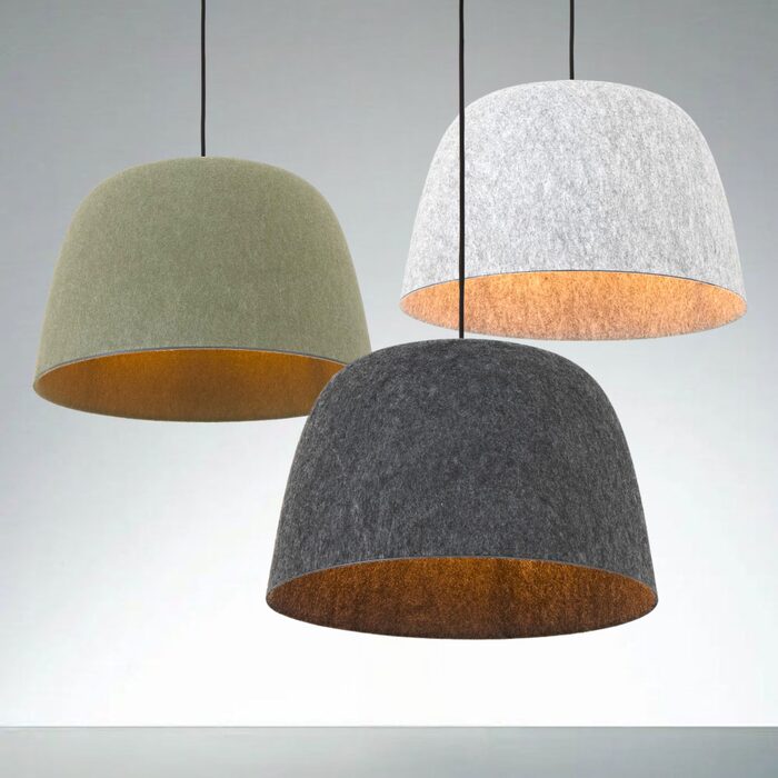 The Malin Pendant, crafted from recycled fibers, offers acoustic benefits, reducing mid-frequency and voice noise by up to 25%.
