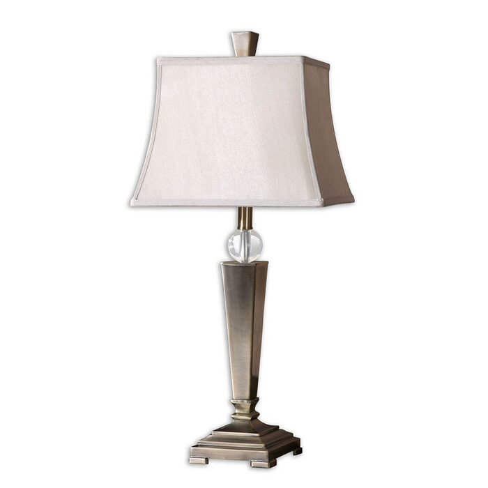 The square semi bell shade is a silken champagne fabric.