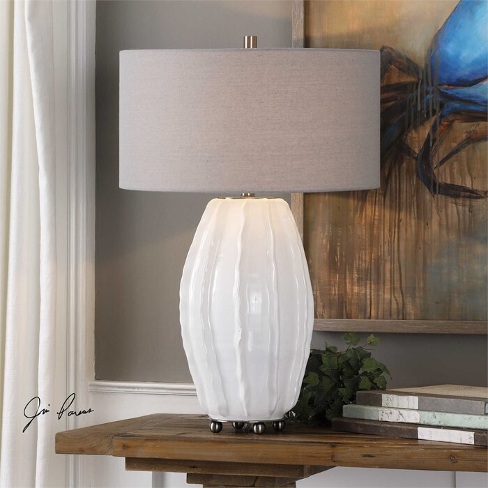 This ceramic lamp features deep ridged edges with an organic feel to the shape, finished in a gloss white glaze, accented with brushed nickel plated details.