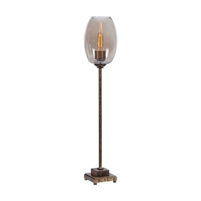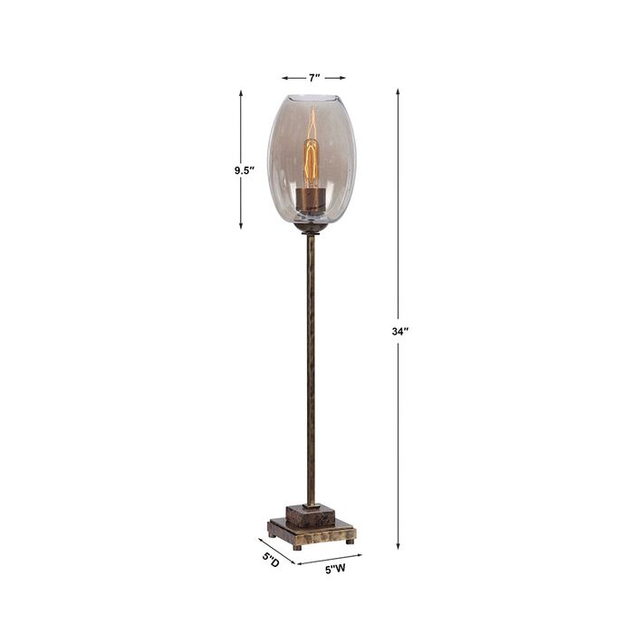 This buffet lamp features a solid iron base finished in antique brushed brass with a hammered texture.
