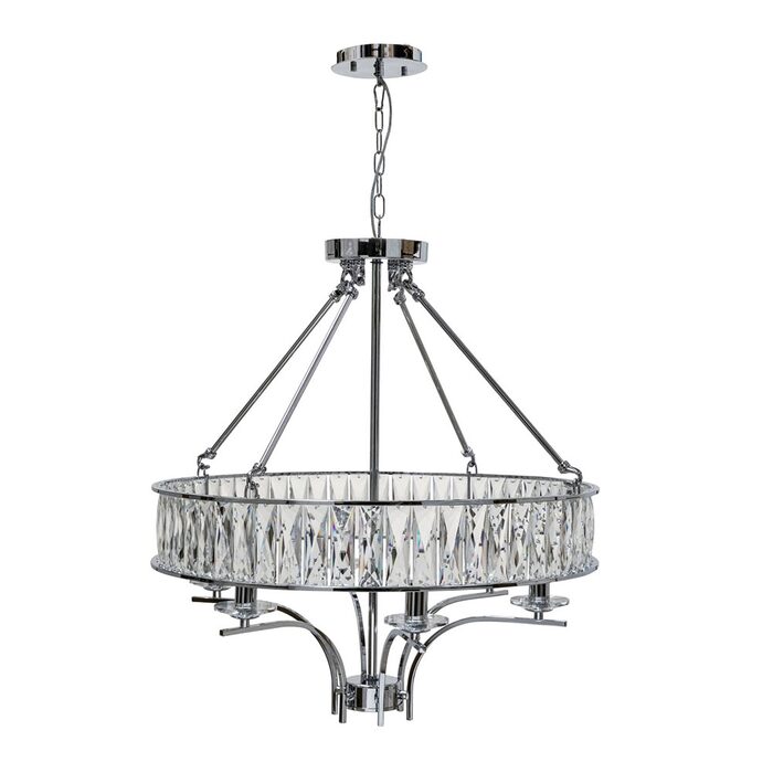 An 6 light drum ceiling pendant with lavish baguette cut faceted crystals. It's a little different from the normal crystal offering as the sparkling gems are set in a chrome finish.
