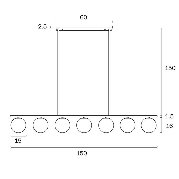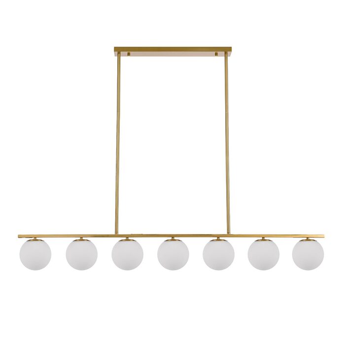Seven glass spheres are fixed below a metal bar giving a robust, yet compact effect to this fixture and a unique character with timeless appeal.