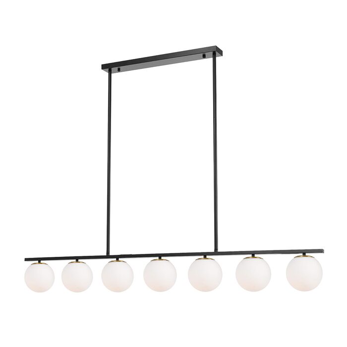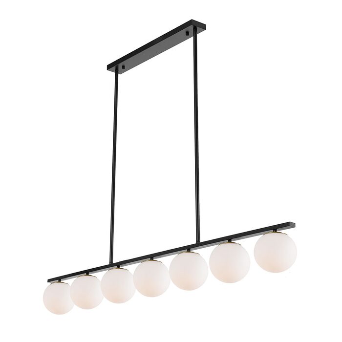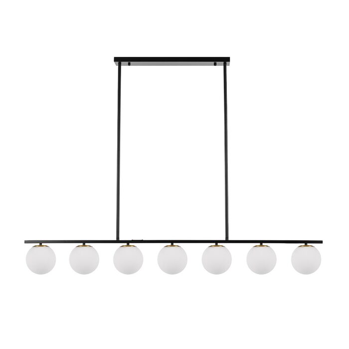 Seven glass spheres are fixed below a metal bar giving a robust, yet compact effect to this fixture and a unique character with timeless appeal.