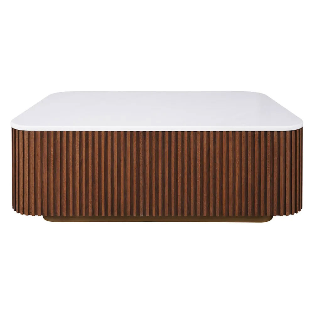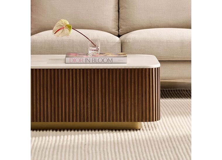 Topped with luxurious Sivec marble, rich in natural veining, it rests on a fluted oak wood base finished in warm walnut, complemented by a sleek metal gold plinth.