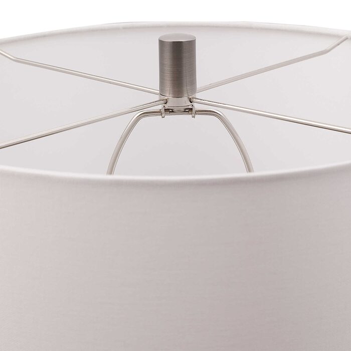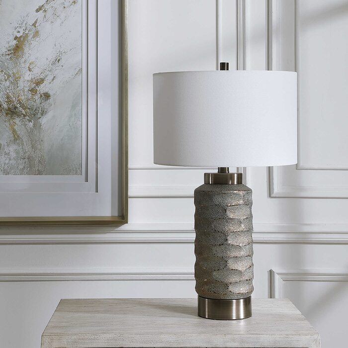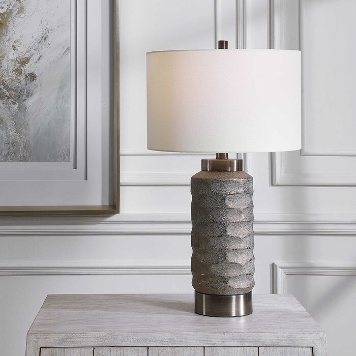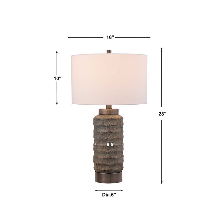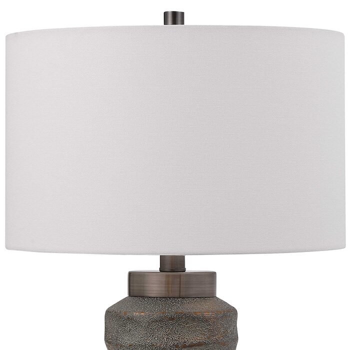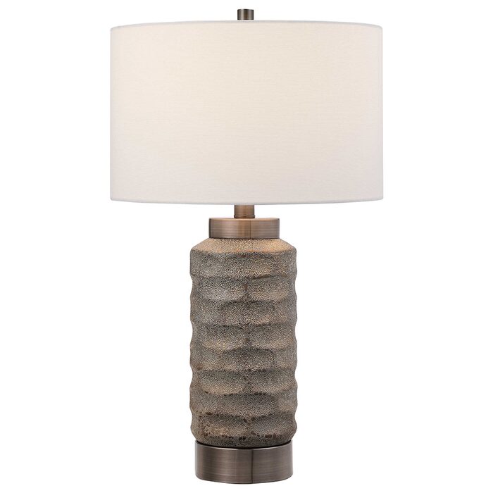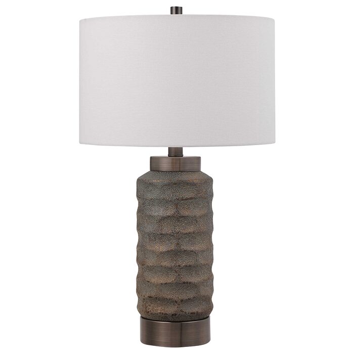 Showcasing a uniquely carved base, this ceramic table lamp features a metallic dark bronze finish with a concrete like texture, accented with black nickel plated details.