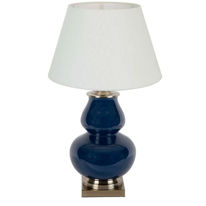 The lamp is available in dark blue or cream colour selection, with square metal base on the bottom.
