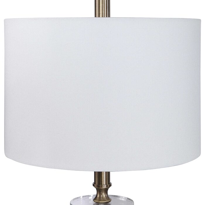 The round hardback drum shade is a white linen fabric.