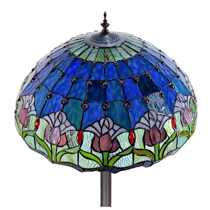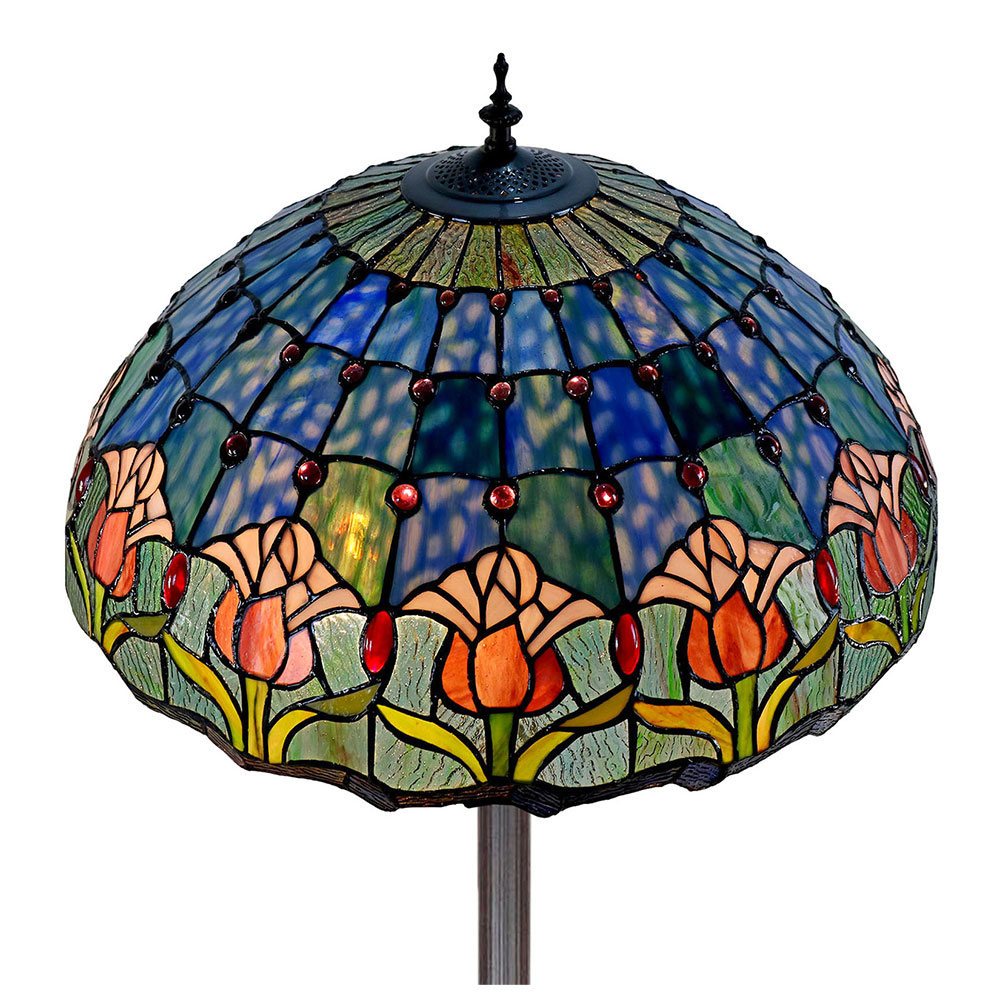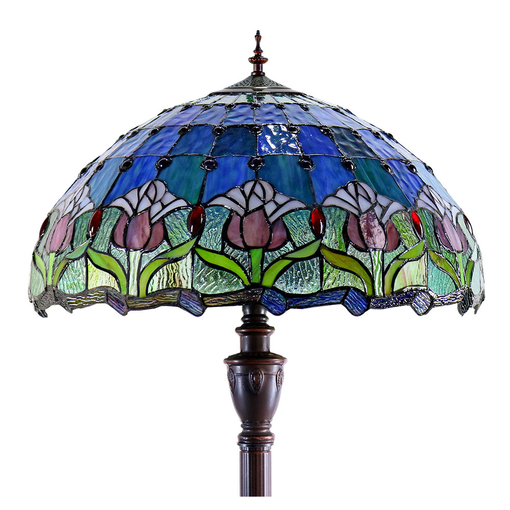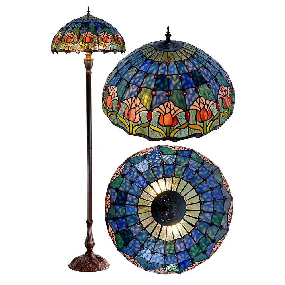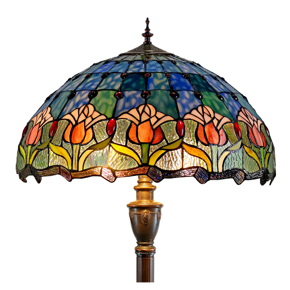 This beautiful floor lamp features a handcrafted, genuine tulip design on stained art glass shade combined with beautiful base and frame made of resin.