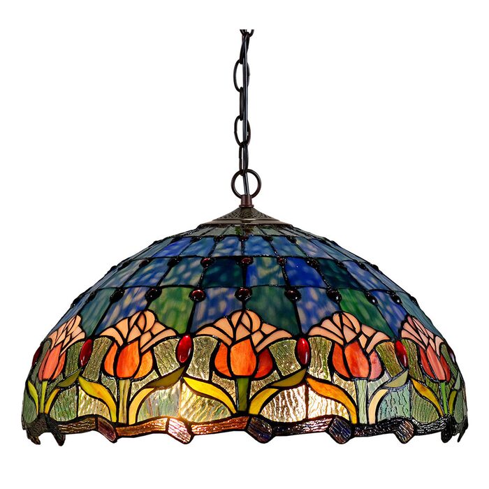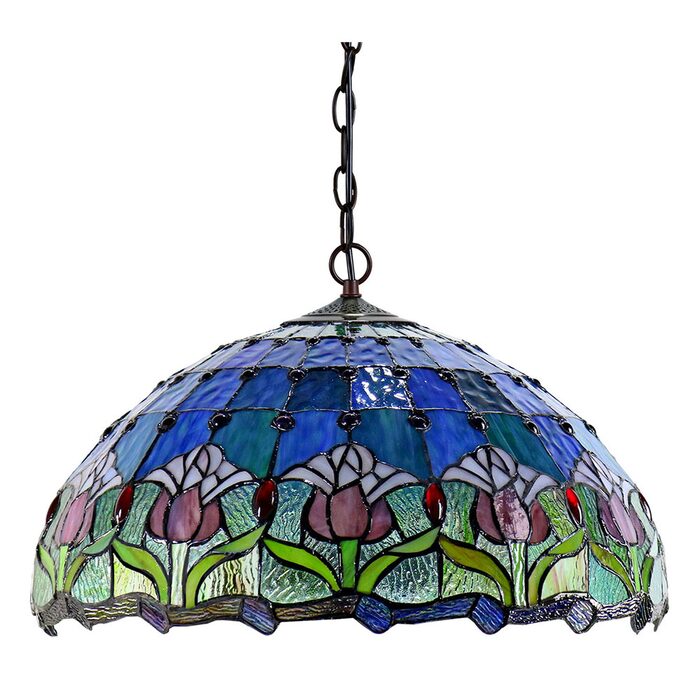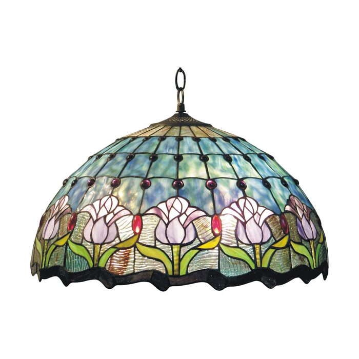 The Mauve Tulip pendant is a colourful Tiffany style lamp that combines many pieces of art glass to create a stunning and complex design.