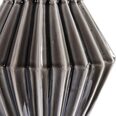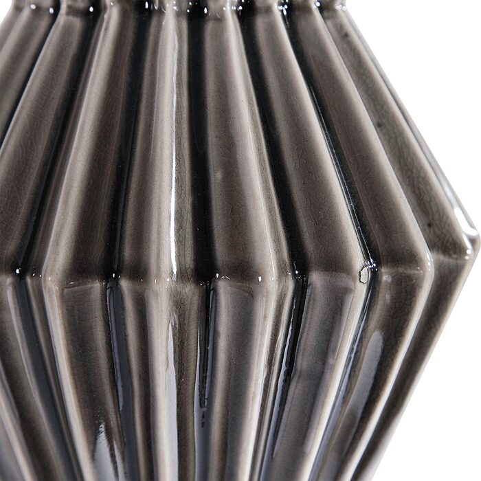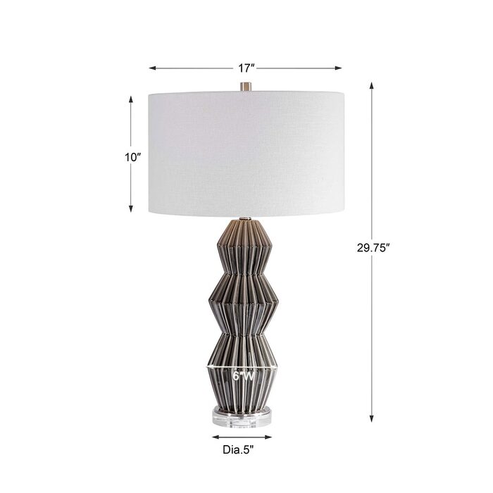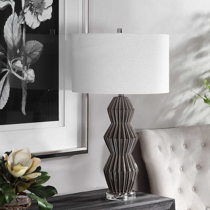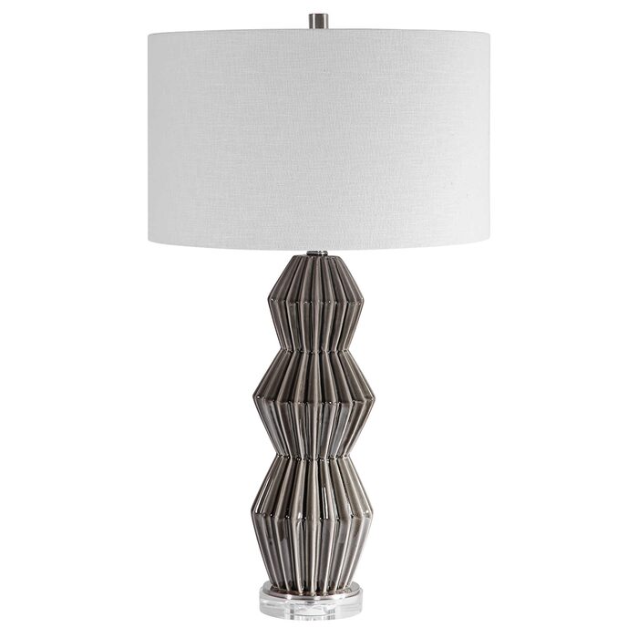 This table lamp features a retro, geometric styled ceramic base finished in a smokey gray glaze with ribbed texture, accented with brushed nickel plated details and a thick crystal foot. The hardback drum shade is a white linen fabric with natural slubbing.