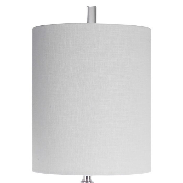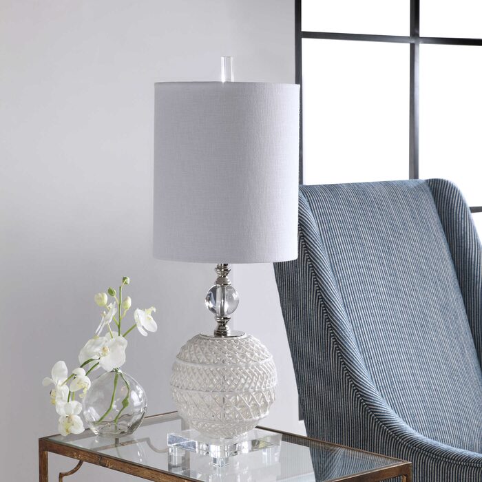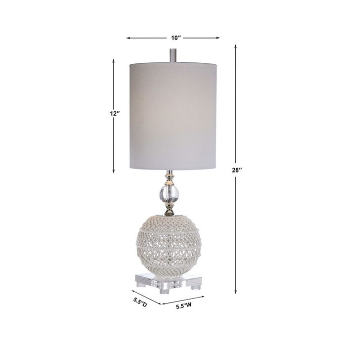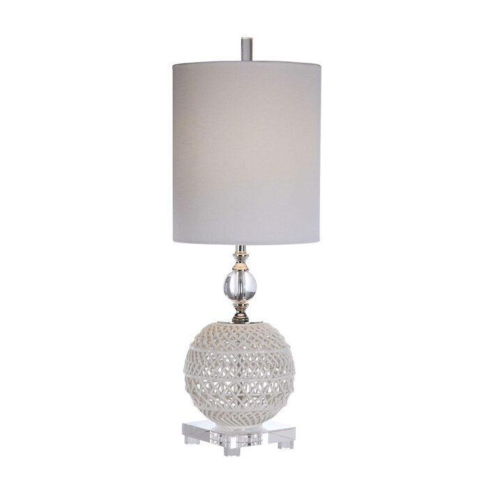 This versatile accent lamp showcases an open ceramic basket weave design in a gloss white glaze with elegant thick crystal details and polished nickel accents.