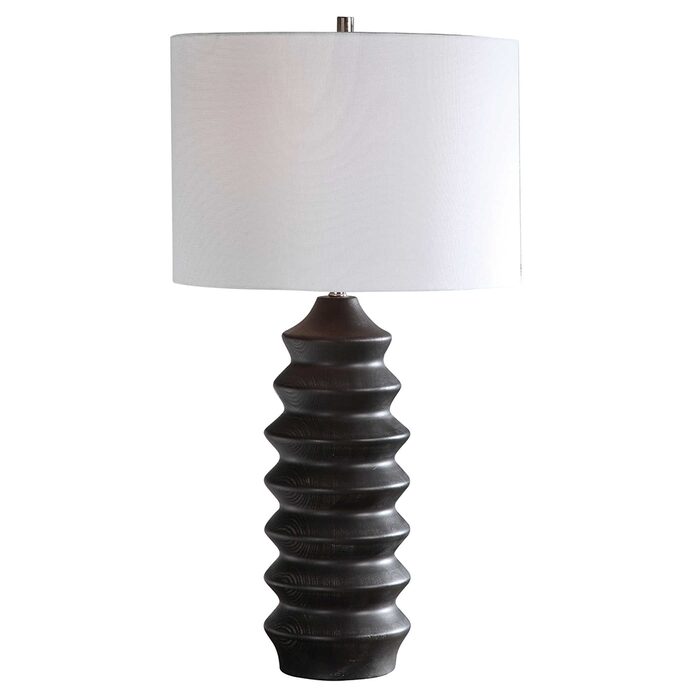 Showcasing a modern lodge style, this table lamp features a carved wood base finished in a rustic black stain exposing subtle wood grain.