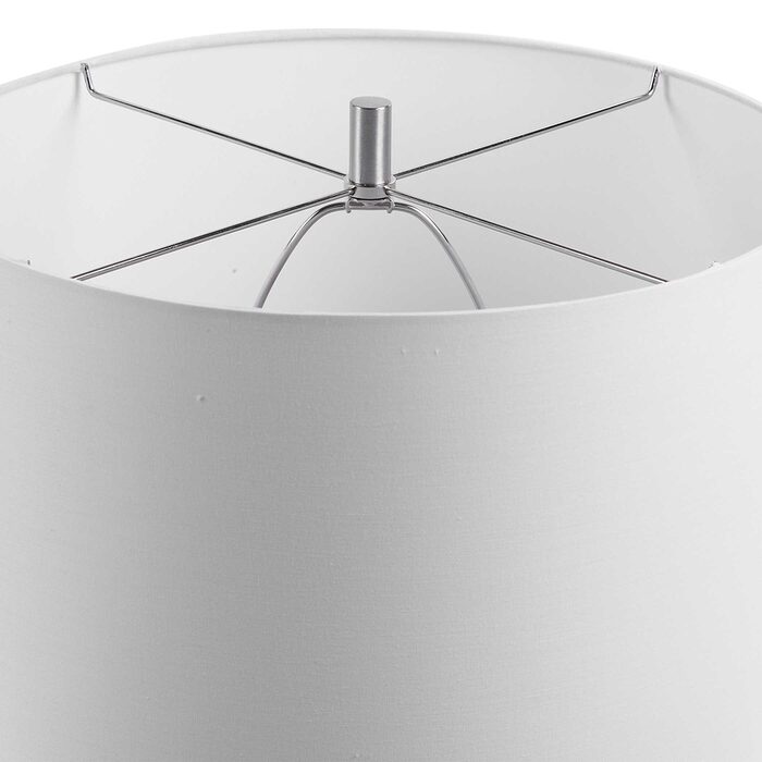 The lamp is paired with a round hardback drum shade in a white linen fabric.