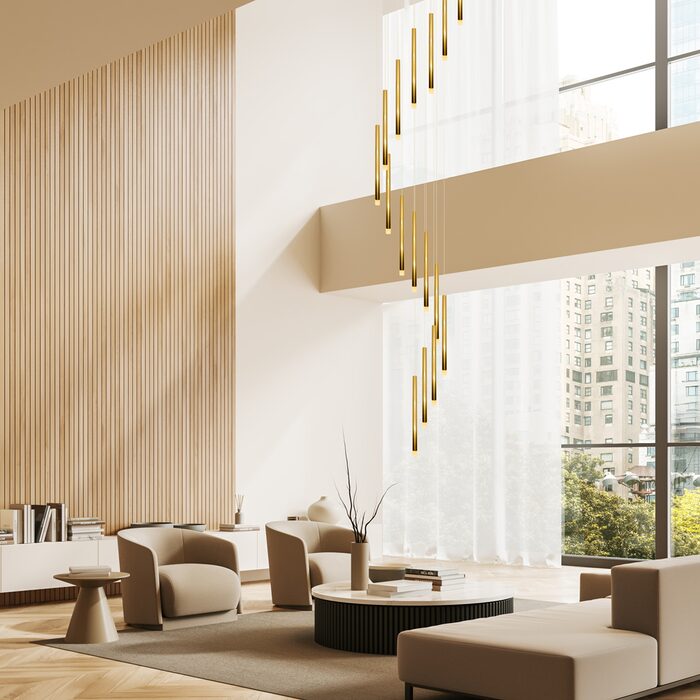 This modern fixture features a sleek gold finish and a minimalist linear design, making it a standout piece in any room.