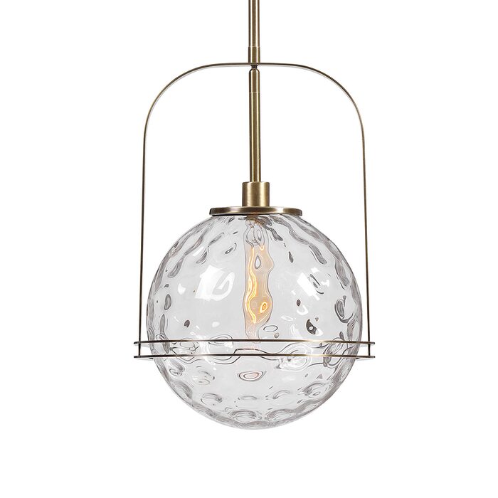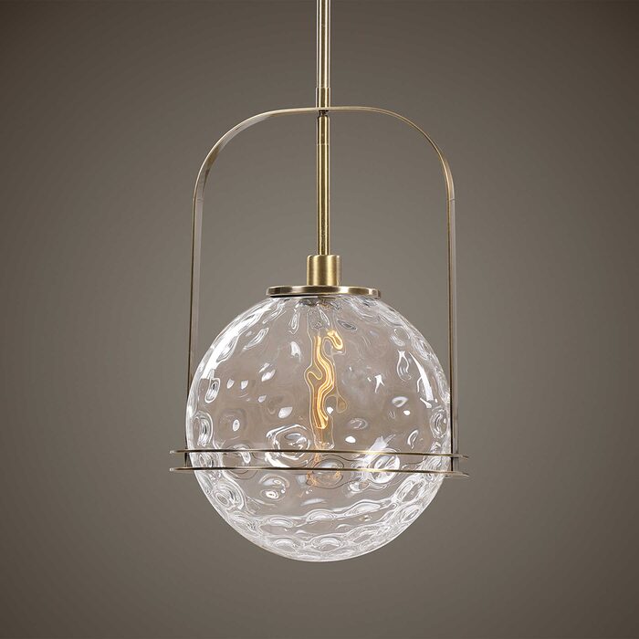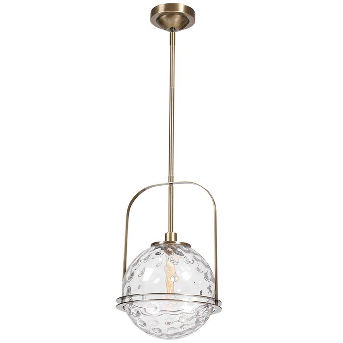 Soft contemporary lines anchor these oversized floating spheres of clear watered glass all enhanced with rich antique brass accents giving a nod to modern design lines also. 1-100 watt max, Edison socket.