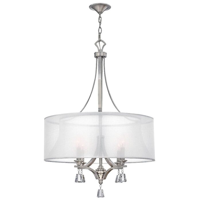 This elegant collection in a Brushed Nickel finish features a sheer translucent double hardback shade and tapered square crystal accents.