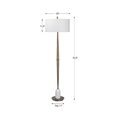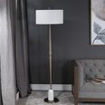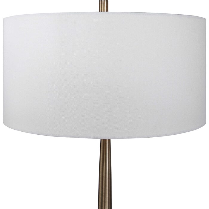 Transitional in design, this floor lamp has a tapered base finished in a plated antique brass, accented with a polished white marble detail.