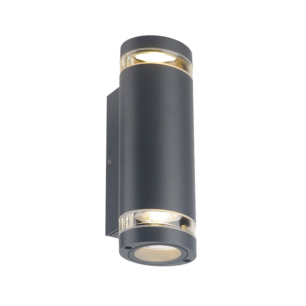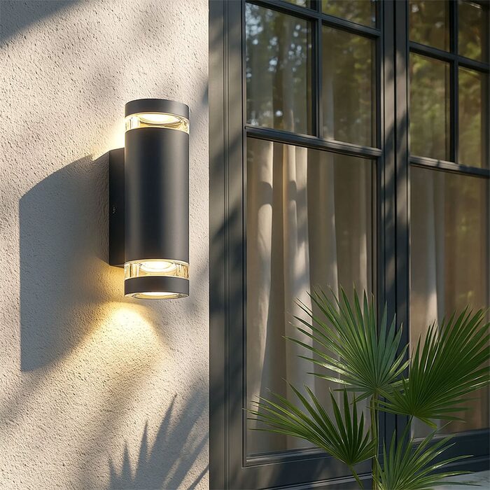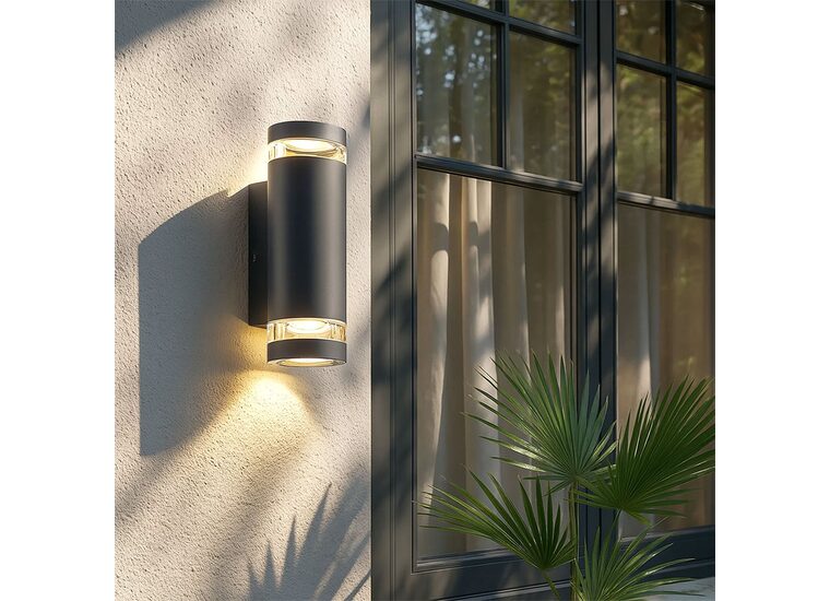 Elevate your outdoor spaces with the Mira Up/Down LED CCT Outdoor Wall Light, featuring a Nordic-inspired double-cylinder design that casts elegant dual-direction illumination to accentuate architecture and brighten pathways.