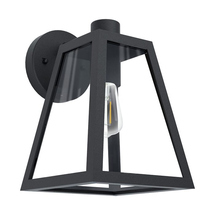 Mirandola is a bold yet simple vintage outdoor wall lamp. The tapered frame holds trapezoid clear glass and is suspended by a simple arm.