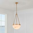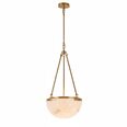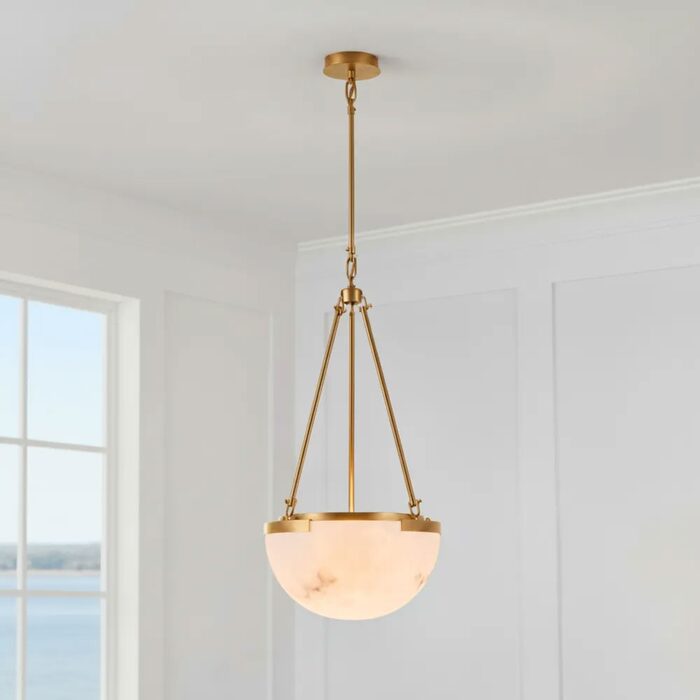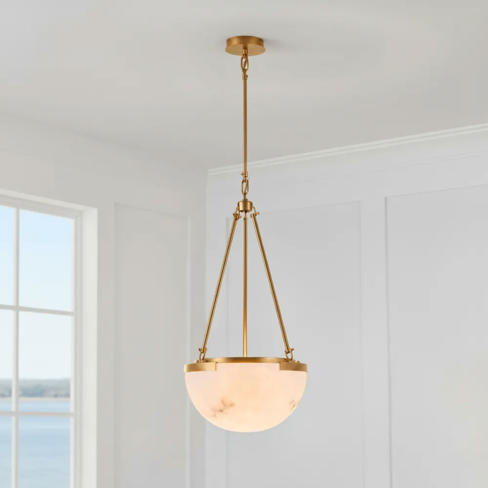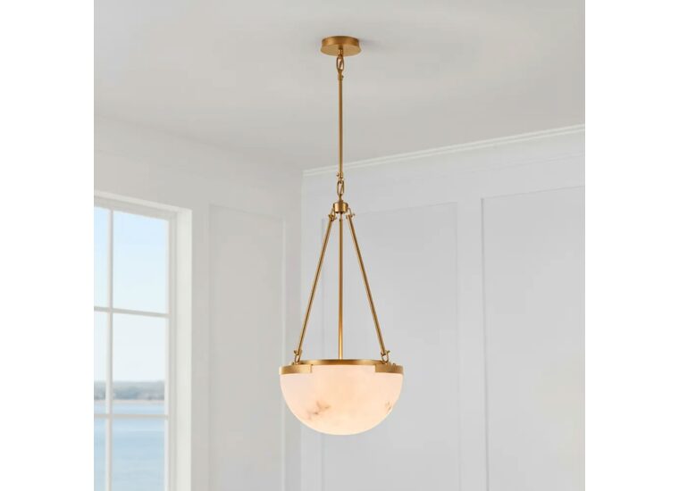 Featuring an electroplated antique brass frame and suspended alabaster-effect bowl diffuser, it casts a soft, ambient glow perfect for dining rooms, foyers, or stairwells.