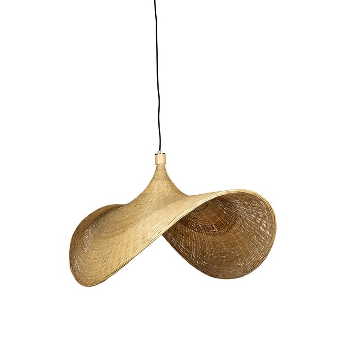 The lampshade, made of natural bamboo, complete with black cable and black canopy, distributes strong light upwards while providing a darker lighting through the shade itself.