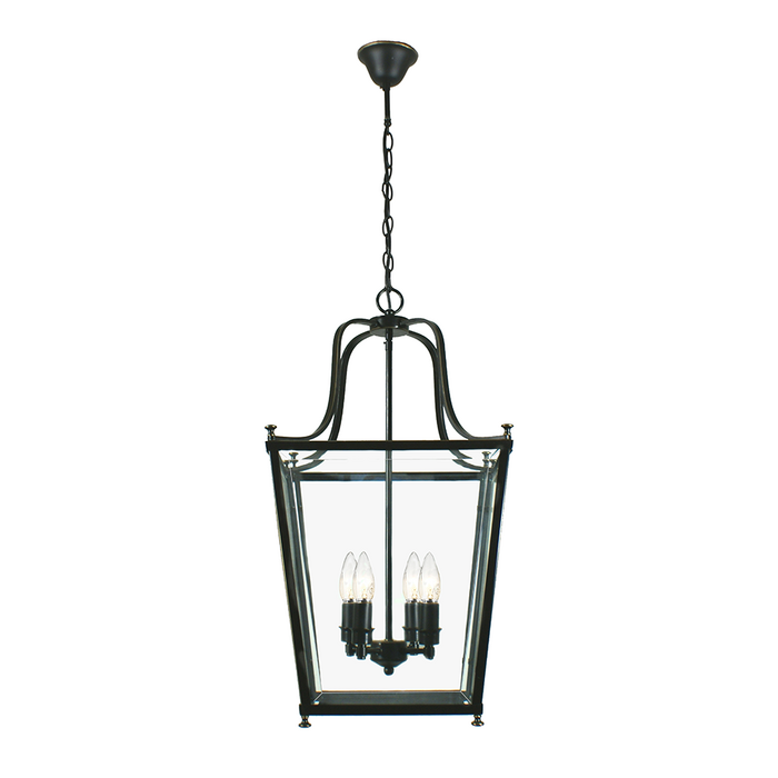 Clear glass panels are installed in the Bronze frames, surrounding the light sources, refracting and distributing light from the bulbs inside.