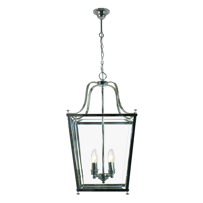Clear glass panels are installed in the Chrome frames, surrounding the light sources, refracting and distributing light from the bulbs inside.